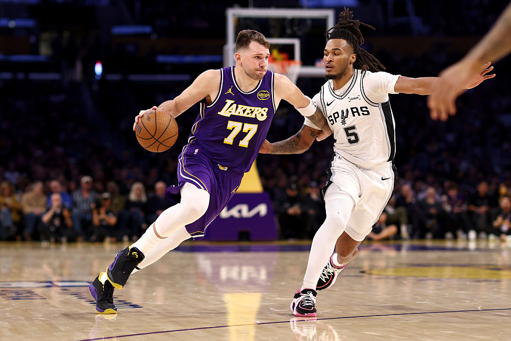 LOS ANGELES, CALIFORNIA - DECEMBER 10: Luka Doncic #77 of the Los Angeles Lakers drives to the basket against Stephon Castle #5 of the San Antonio Spurs during the fourth quarter of the Emirates NBA Cup quarterfinal at Crypto.com Arena on December 10, 2025 in Los Angeles, California. NOTE TO USER: User expressly acknowledges and agrees that, by downloading and/or using this Photograph, user is consenting to the terms and conditions of the Getty Images License Agreement. (Photo by Katelyn Mulcahy/Getty Images)
