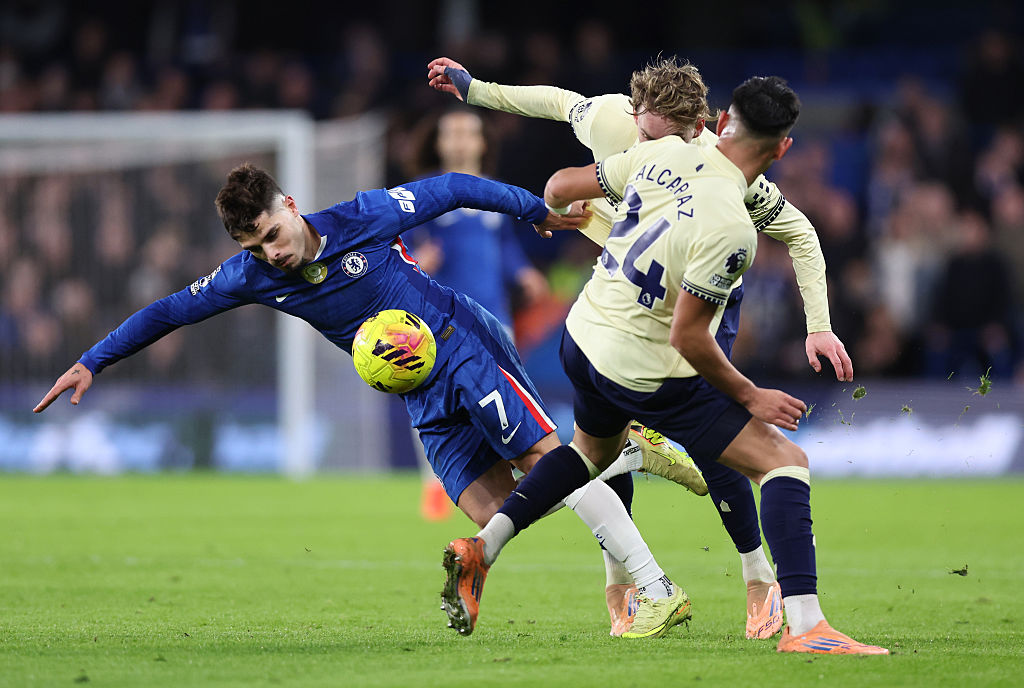 LONDON, ENGLAND - DECEMBER 13: Pedro Neto of Chelsea is challenged by James Garner (obscured) and Carlos Alcaraz of Everton during the Premier League match between Chelsea and Everton at Stamford Bridge on December 13, 2025 in London, England. (Photo by Chris Lee - Chelsea FC/Chelsea FC via Getty Images)