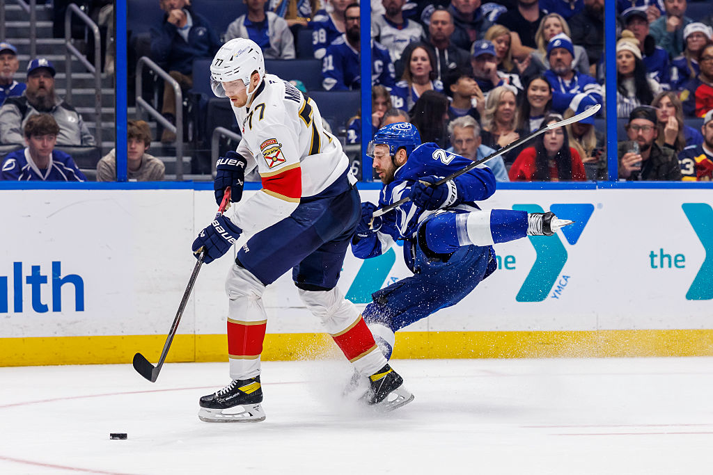 TAMPA, FL - DECEMBER 15: Zemgus Girgensons #28 of the Tampa Bay Lightning is hit by Niko Mikkola #77 of the Florida Panthers at Benchmark International Arena on December 15, 2025 in Tampa, Florida. (Photo by Mark LoMoglio/NHLI via Getty Images)