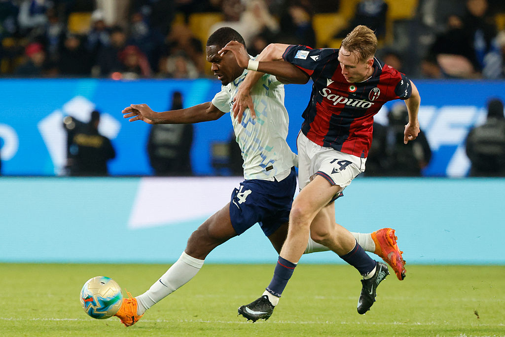 Inter Milan's French forward #14 Ange-Yoan Bonny (L) fights for the ball with Bologna's Norwegian defender #14 Torbjorn Heggem (R) during the Italian Super Cup semi-final match between Inter Milan and Bologna FC 1909 at King Al-Awwal Park Stadium, in Riyadh on December 19, 2025. (Photo by Fayez Nureldine / AFP via Getty Images)