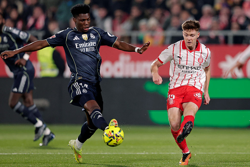 GIRONA, SPAIN - NOVEMBER 30: (L-R) Aurelien Tchouameni of Real Madrid, Viktor Tsygankov of Girona during the LaLiga EA Sports match between Girona v Real Madrid at the Estadi Municipal Montilivi on November 30, 2025 in Girona Spain (Photo by Rico Brouwer/Soccrates/Getty Images)