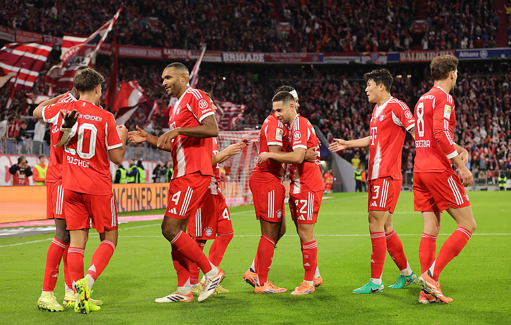 MUNICH, GERMANY - NOVEMBER 1: Serge Gnabry of FC Bayern München celebrates with teammates after scoring his team's first goal during the Bundesliga match between FC Bayern München and Bayer 04 Leverkusen at Allianz Arena on November 1, 2025 in Munich, Germany. (Photo by Marcel Engelbrecht - firo sportphoto/Getty Images) https://sportarena.ua/uk/footboll/bundesliga/bavariya-volfsburg-video-oglyad-matchu-za-11/