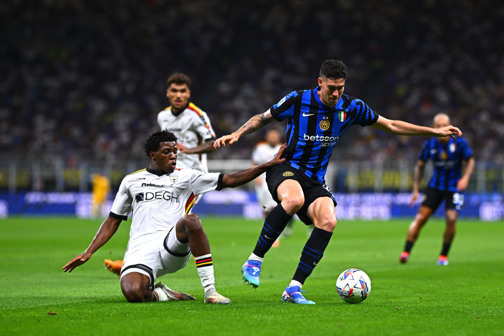 MILAN, ITALY - AUGUST 24: Alessandro Bastoni of FC Internazionale competes for the ball with Patrick Dorgu of Lecce during the Serie A match between Inter and Lecce at Stadio Giuseppe Meazza on August 24, 2024 in Milan, Italy. (Photo by Mattia Ozbot - Inter/Inter via Getty Images)