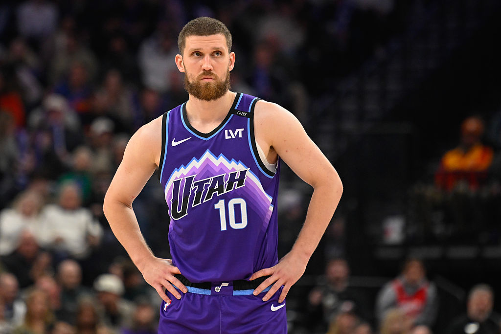 SALT LAKE CITY, UTAH - DECEMBER 01: Svi Mykhailiuk #10 of the Utah Jazz looks on during the second half of a game against the Houston Rockets at Delta Center on December 01, 2025 in Salt Lake City, Utah. NOTE TO USER: User expressly acknowledges and agrees that, by downloading and or using this photograph, User is consenting to the terms and conditions of the Getty Images License Agreement. (Photo by Alex Goodlett/Getty Images)