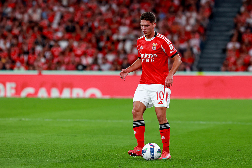 LISBON, PORTUGAL - SEPTEMBER 12: Sudakov of SL Benfica controls the ball during the Primeira Liga match between SL Benfica and CD Santa Clara at Estadio da Luz on September 12, 2025 in Lisbon, Portugal. (Photo by Valter Gouveia/Sports Press Photo/Getty Images)