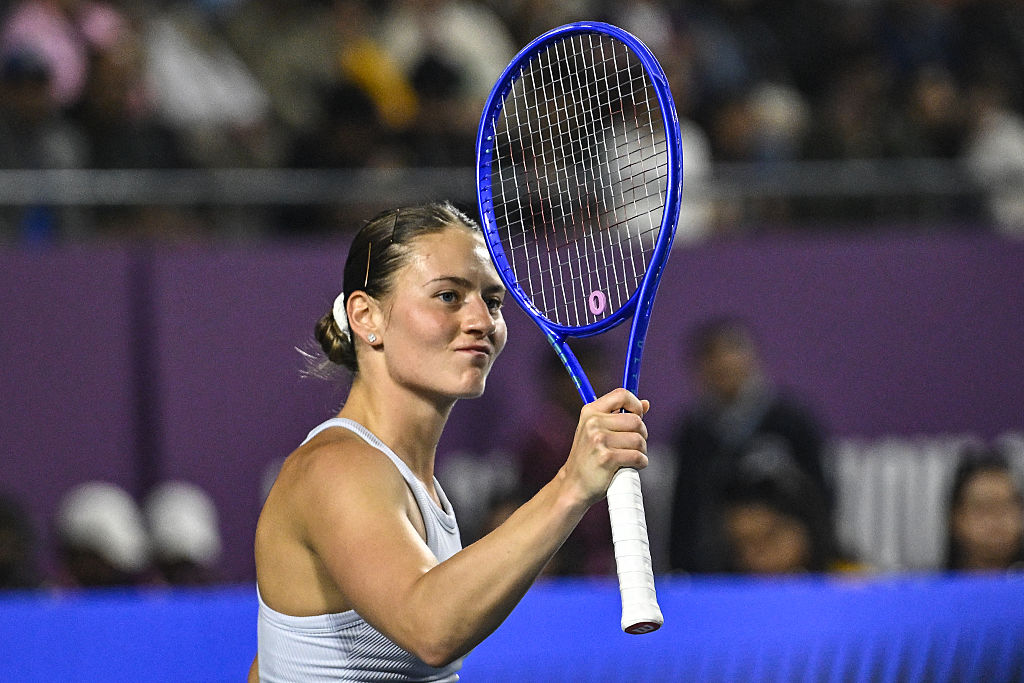Ukraine's Marta Kostyuk of Aussie Mavericks Kites reacts as she competes against India's Shrivalli Bhamidipaty of AOS Eagles during their women's singles final match at the 2025 World Tennis League in Bengaluru on December 20, 2025. (Photo by Idrees MOHAMMED / AFP via Getty Images)