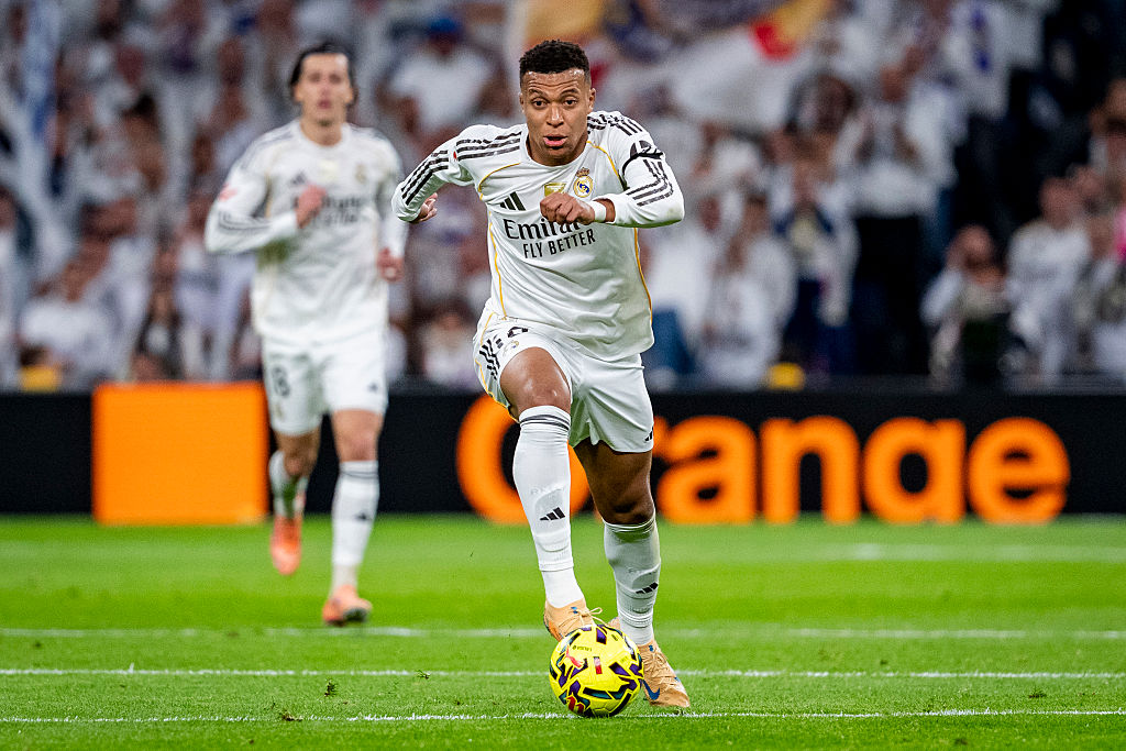 Kylian Mbappe of Real Madrid is in action with the ball during the LaLiga EA Sports football match between Real Madrid CF and RC Celta de Vigo at Estadio Bernabeu in Madrid, Spain, on December 7, 2025. (Photo by Alberto Gardin/NurPhoto via Getty Images)