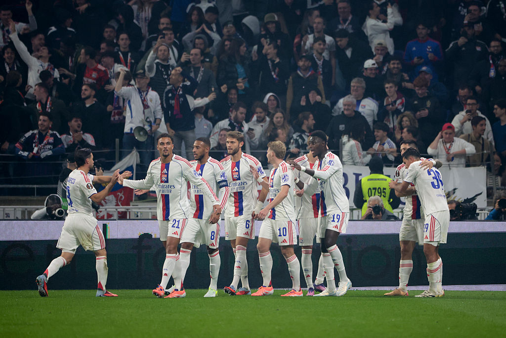 LYON, FRANCE - OCTOBER 2: Players of Lyon celebrate the goal of Martin Satriano of Lyon during the UEFA Europa League 2025/26 League Phase MD2 football match between Olympique Lyonnais (OL) and FC Salzburg at Groupama Stadium on October 2, 2025 in Decines-Charpieu near Lyon, France. (Photo by Jean Catuffe/Getty Images)