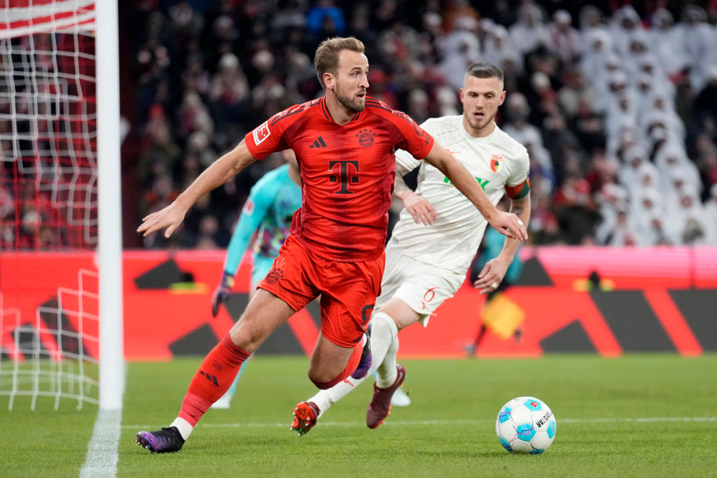 MUNICH, GERMANY - NOVEMBER 22: Harry Kane of Bayern Munich runs with the ball whilst under pressure from Jeffrey Gouweleeuw of FC Augsburg during the Bundesliga match between FC Bayern München and FC Augsburg at Allianz Arena on November 22, 2024 in Munich, Germany. (Photo by F. Noever/FC Bayern via Getty Images)