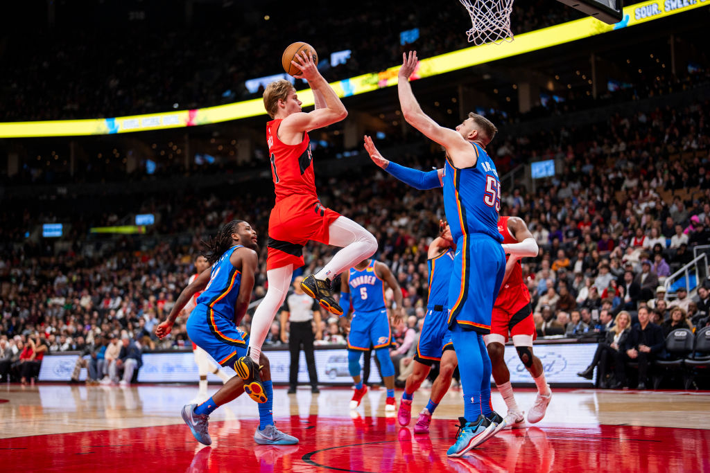 TORONTO, ON - DECEMBER 05: Gradey Dick #1 of the Toronto Raptors drives to the basket against Isaiah Hartenstein #55 of the Oklahoma City Thunder at Scotiabank Arena on December 5, 2024 in Toronto, Ontario, Canada. NOTE TO USER: User expressly acknowledges and agrees that, by downloading and/or using this Photograph, user is consenting to the terms and conditions of the Getty Images License Agreement. (Photo by Andrew Lahodynskyj/Getty Images)